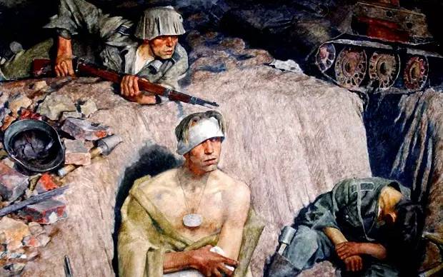 画面中,一位身着军装的德国士兵正望着附近的战场。人们已经无法从这幅画中看出希特勒早期对建筑物的细致刻画,相反,重点变成了画面中的人物形象。