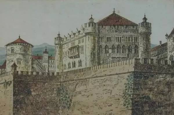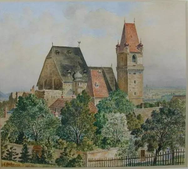 这幅创作于1910年的作品描绘了一座被城墙包围的城堡。与希特勒其他作品不同,这幅作品对细节的刻画非常到位。但是,作品表现的气氛却是阴郁多于优美。