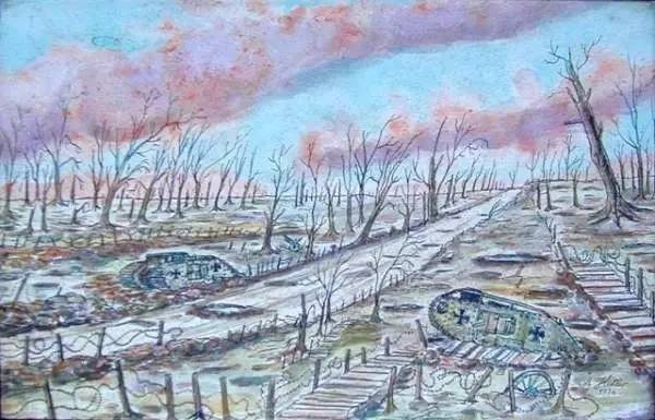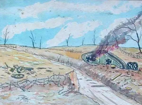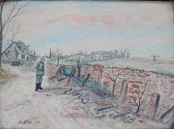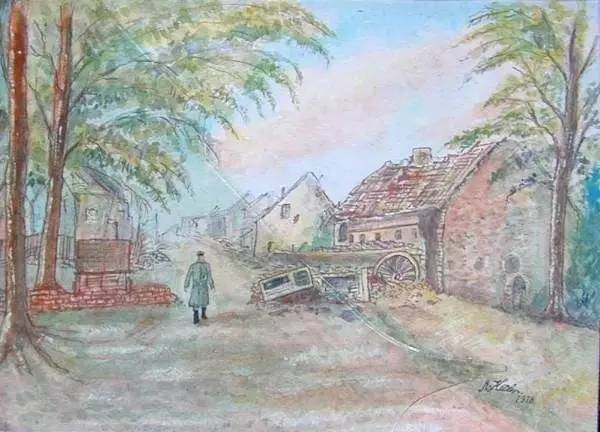 希特勒在一战期间的绘画风格明显不同于早期作品。比如,这一时期作品的风格通常比早期的作品更抽象、残酷。作品也通常以战场或被战争摧毁的建筑为主题。这幅作品中,我们可以看到一位身着风衣的士兵正沿着小路进入一座法国小镇。